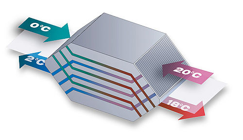 Plākšņu veidam ir mazliet cits darbības princips. Tajā gaiss plūst starp alumīnija plāksnītēm pamīšos virzienos. Vienā nodalījumā vienā virzienā, blakus nodalījumā pretējā. Tādā veidā plūsmas nekrustojas – izplūstošā gaisa nodalījums caur alumīnija plāksnīti atdod siltumu ienākošam nodalījumam. Šādu, ar plāksnītēm nodalītu nodalījumu, ir daudz.